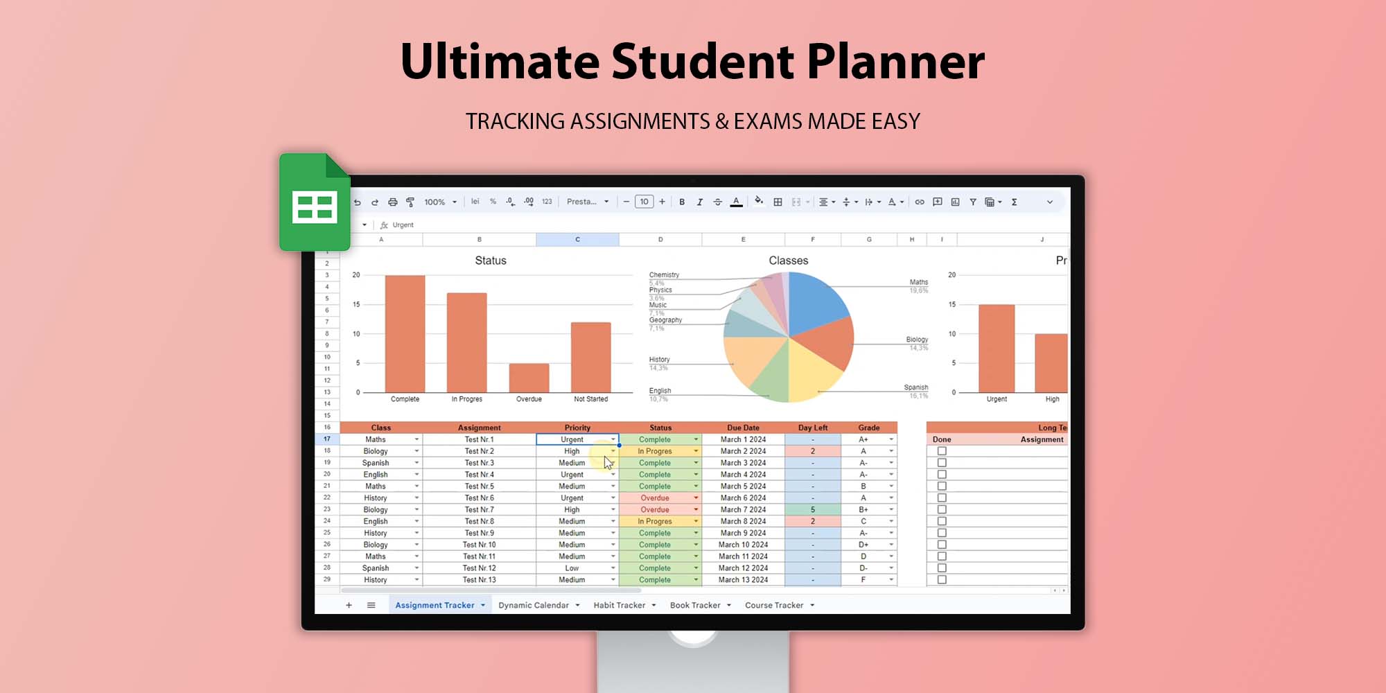 Academic Student Planner Spreadsheet, School Assignment Tracker Google Sheets, College Study Tracker Template,University Planner